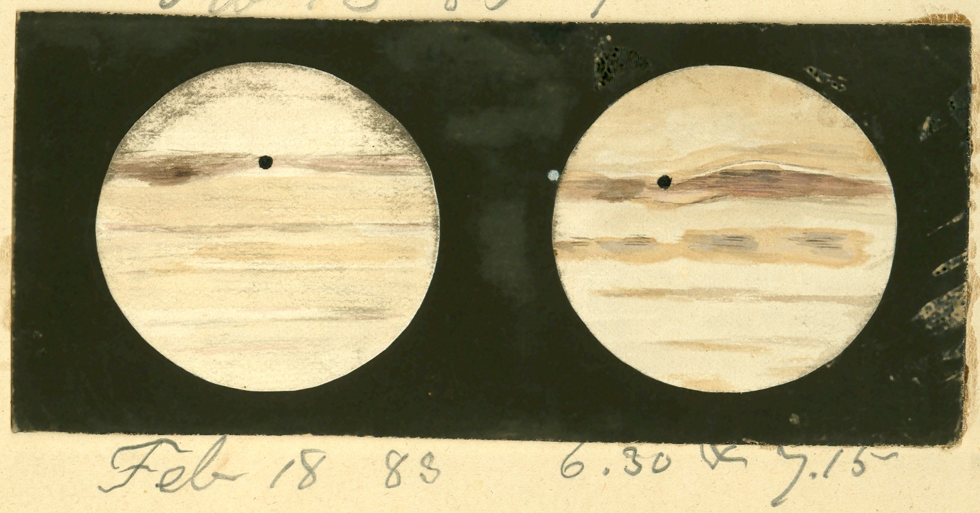 Jupiter as it appeared on 1883 Feb 18th at 06:30 and 07:15. Sketch by A.F. Miller.